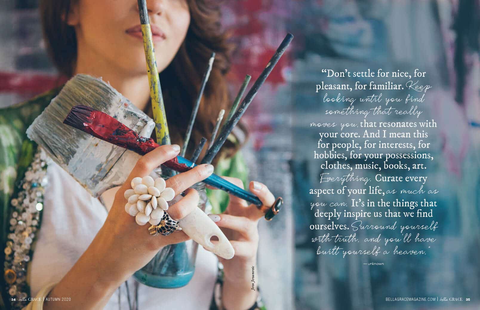 We love including inspirational quotes in each issue of Bella Grace. These are just a few of the inspiring words you’ll find in Issue 25: “Don’t settle for nice, for pleasant, for familiar. Keep looking until you find something that really moves you, that resonates with your core. And I mean this for people, for interests, for hobbies, for your possessions, clothes, music, books, art. Everything. Curate every aspect of your life, as much as you can. It’s in the things that deeply inspire us that we find ourselves. Surround yourself with truth, and you’ll have built yourself a heaven.”