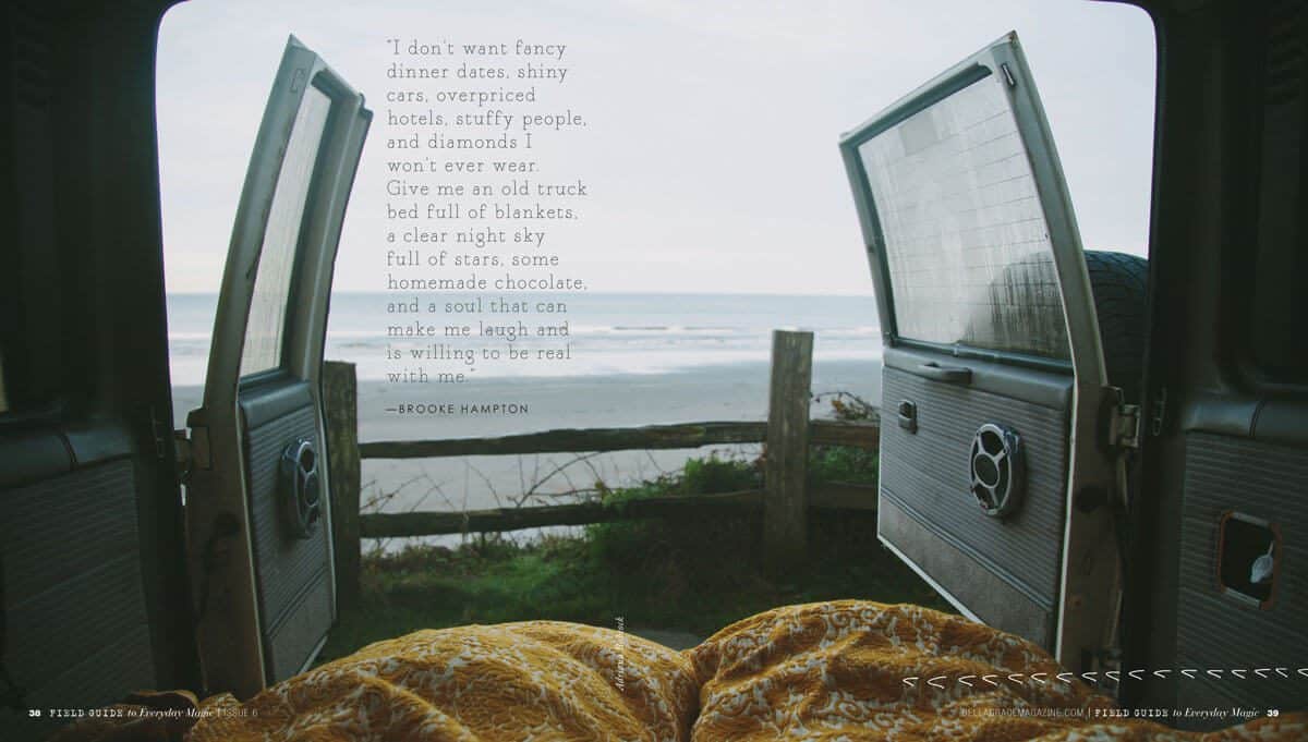 “I don’t want fancy dinner dates, shiny cars, overpriced hotels, stuffy people, and diamonds I won’t ever wear. Give me an old truck bed full of blankets, a clear night sky full of stars, some homemade chocolate, and a soul that can make me laugh and is willing to be real with me.” We love this quote by Brooke Hampton that reminds us of life’s simple joys. Discover several more inspiring excerpts inside this issue!