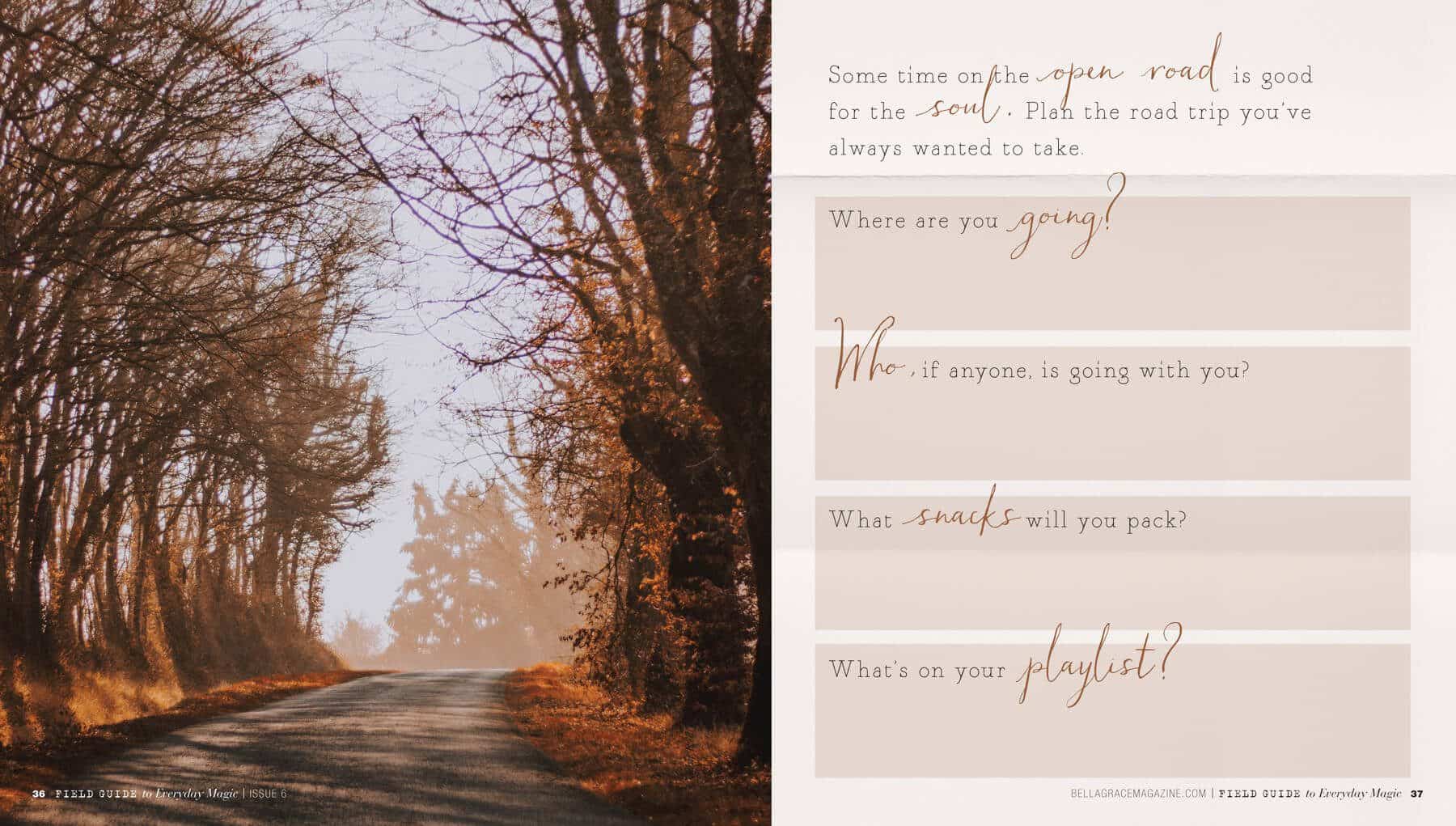 Fall into a daydream of your ideal road trip. Where are you going? What’s on your playlist? Jot your plans down on page 37 of Field Guide.