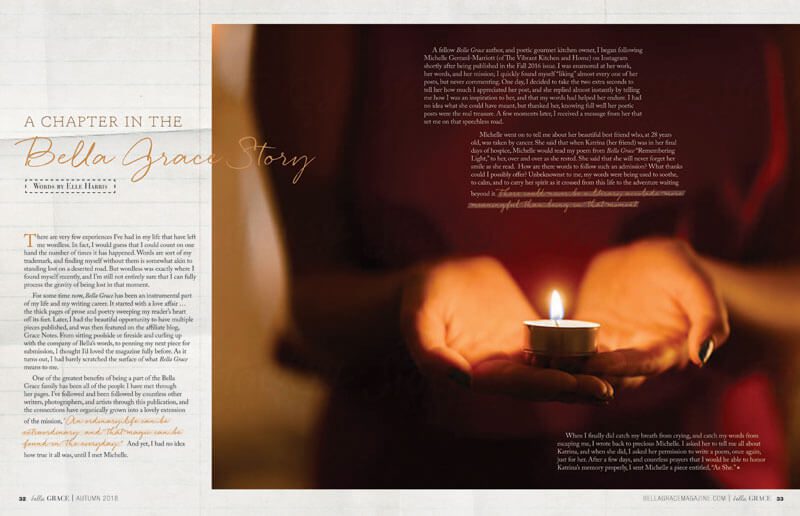 In this heart-warming piece by Elle Harris, she shares how Bella Grace brought her together with, fellow Bella Grace reader and author, Michelle Gerrard-Marriott. Their words have inspired and uplifted each other in some of the most difficult times they have experienced.